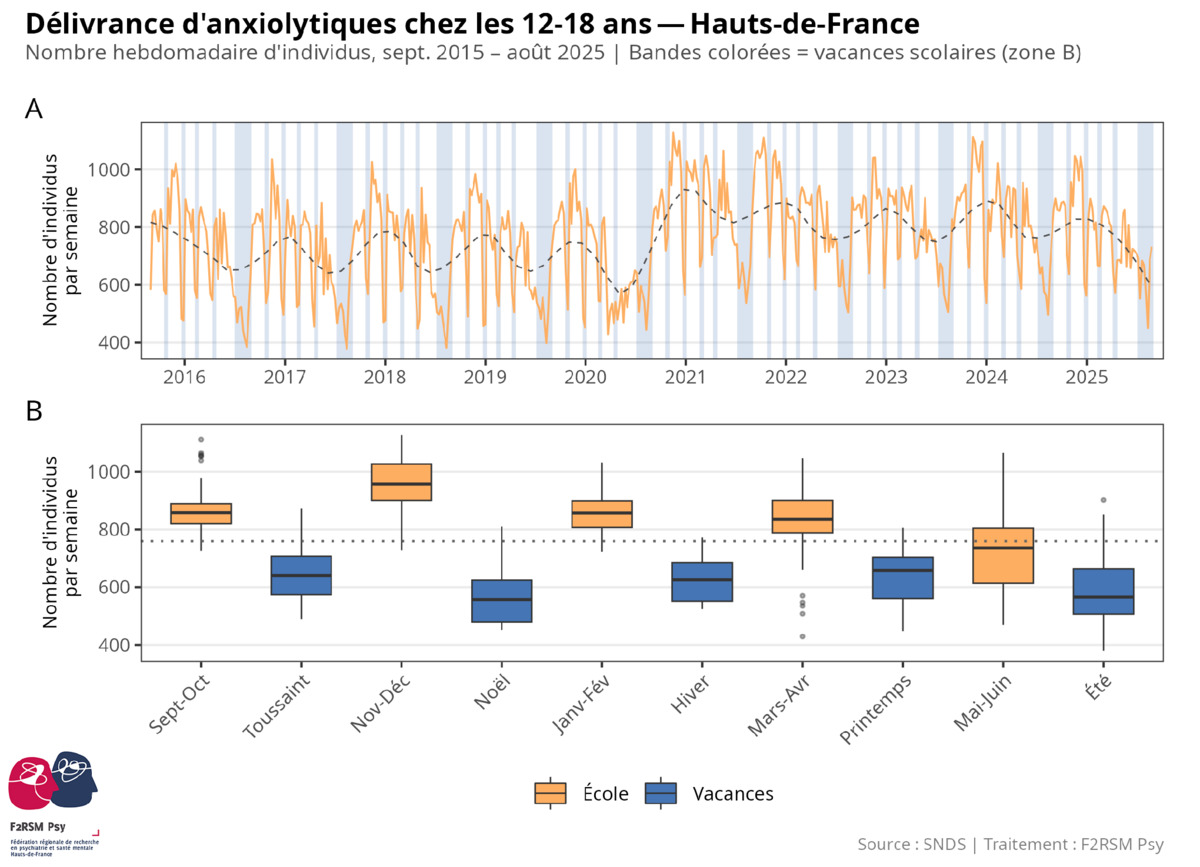 À partir de la base de données du SNDS, nous avons mesuré le nombre d'individus de 12 à 18 ans recevant une délivrance d'anxiolytiques chaque semaine entre septembre 2015 et août 2025. Les semaines ont ensuite été catégorisées en semaines de vacances ou d'école. Les anxiolytiques sont plus délivrés pendant les périodes scolaires que pendant les vacances (846 [775–917] vs 584 [522–677] individus par semaine, médiane [Q1–Q3]). La période de novembre-décembre est celle pour laquelle il y a le plus de délivrances (957 [900–1027]).