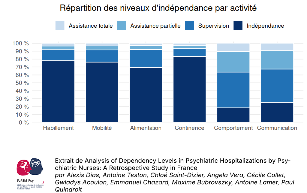 La figure du mois d'octobre 2025 illustre la répartition des niveaux d’indépendance parmi six dimensions de la vie quotidienne évaluées chez les patients adultes en hospitalisation en temps plein en psychiatrie adulte :