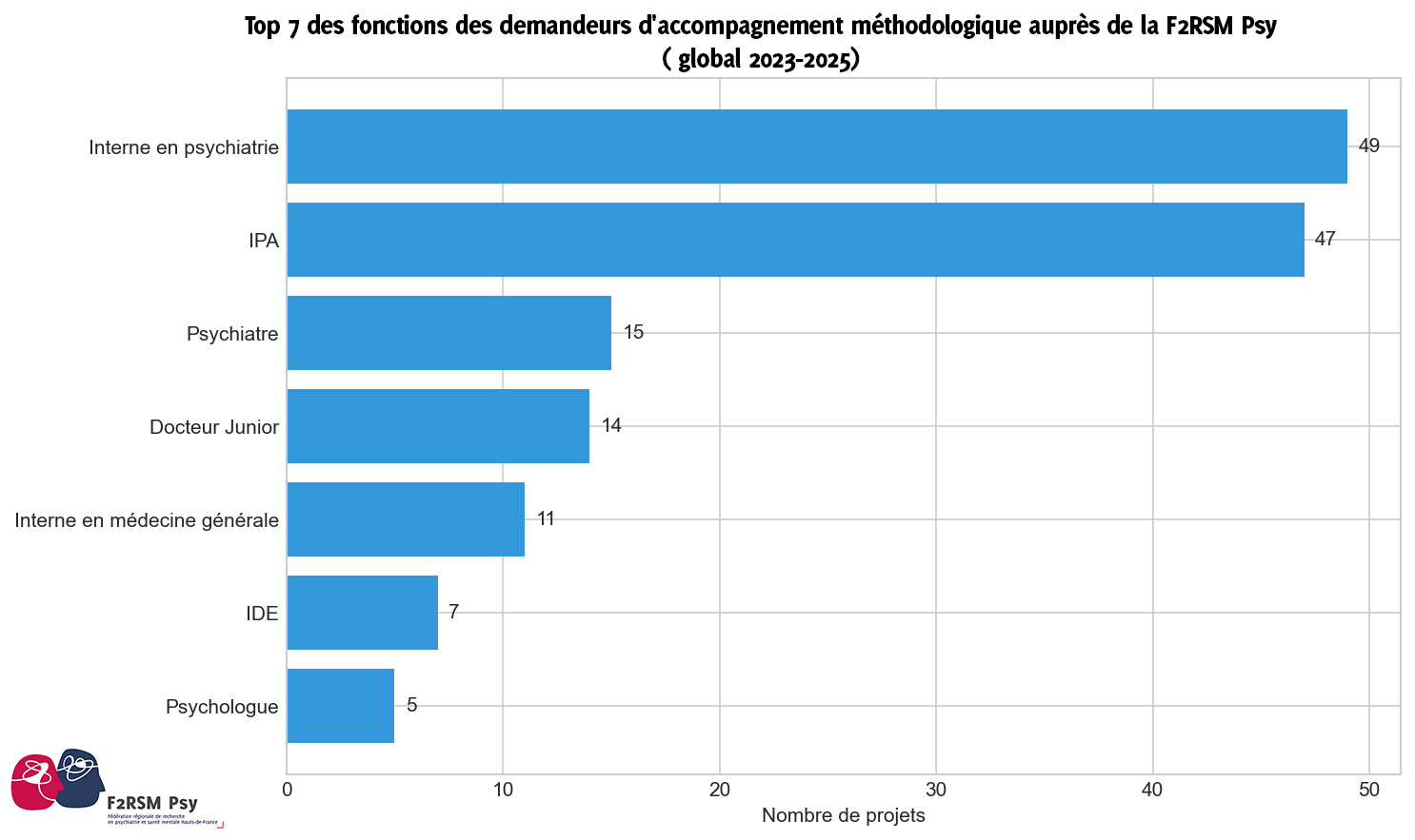 Ce graphique présente les 7 profils professionnels les plus représentés parmi les demandeurs d'accompagnement méthodologique auprès de la F2RSM Psy entre 2023 et 2025. Fait marquant : 6 ans aprés le déploiement des IPA PSM (décret paru le 12 août 2019), cette fonction représente le deuxième contingent de demandeurs d'un accompagnement, quasiment à égalité avec les internes en psychiatrie.
